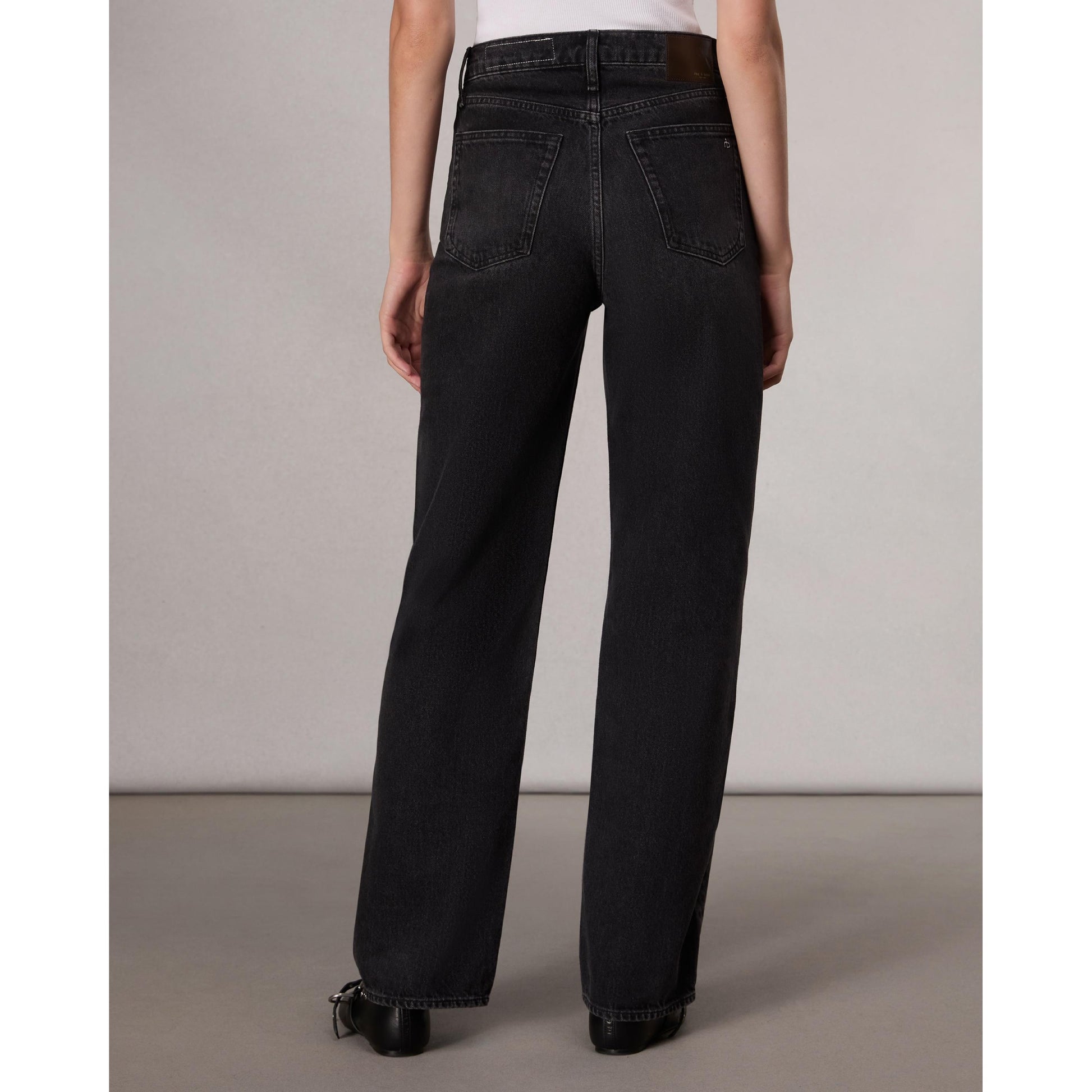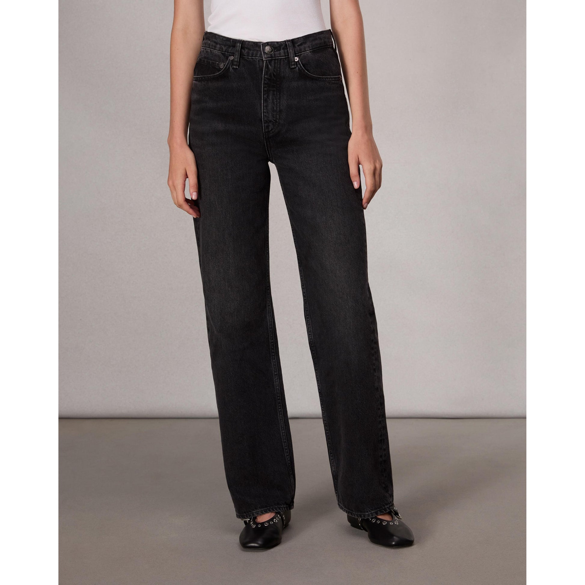 The Shea. This high-rise jean is designed with a relaxed, straight leg. Crafted from Lightweight Rigid non-stretch denim that provides structure, but breaks in over time for a soft and comfortable feel. In Black Stone, a washed black.