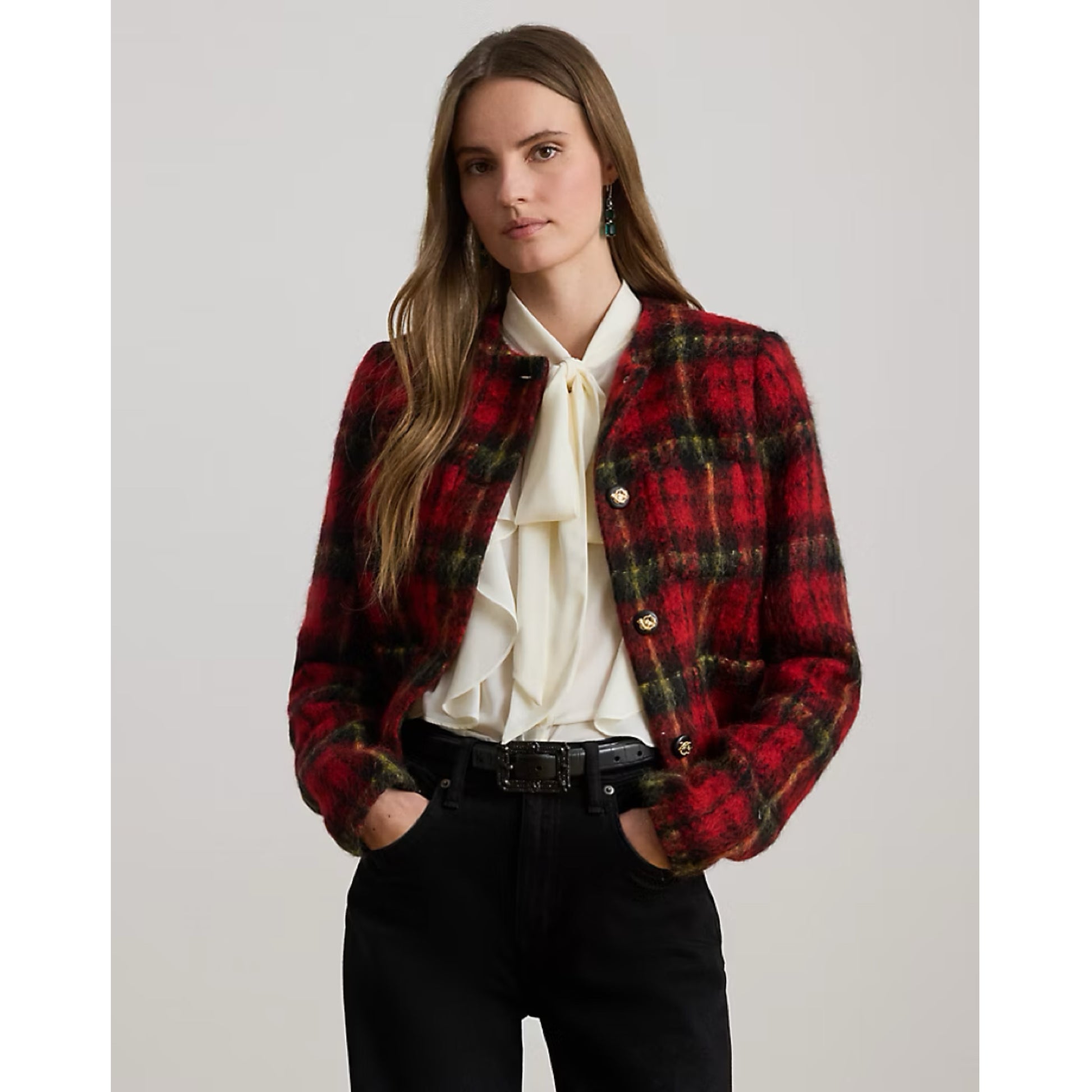 Rich fabric lightly kissed with wool and alpaca fibers brings ultimate warmth to this boxy, cropped jacket covered in festive plaid.