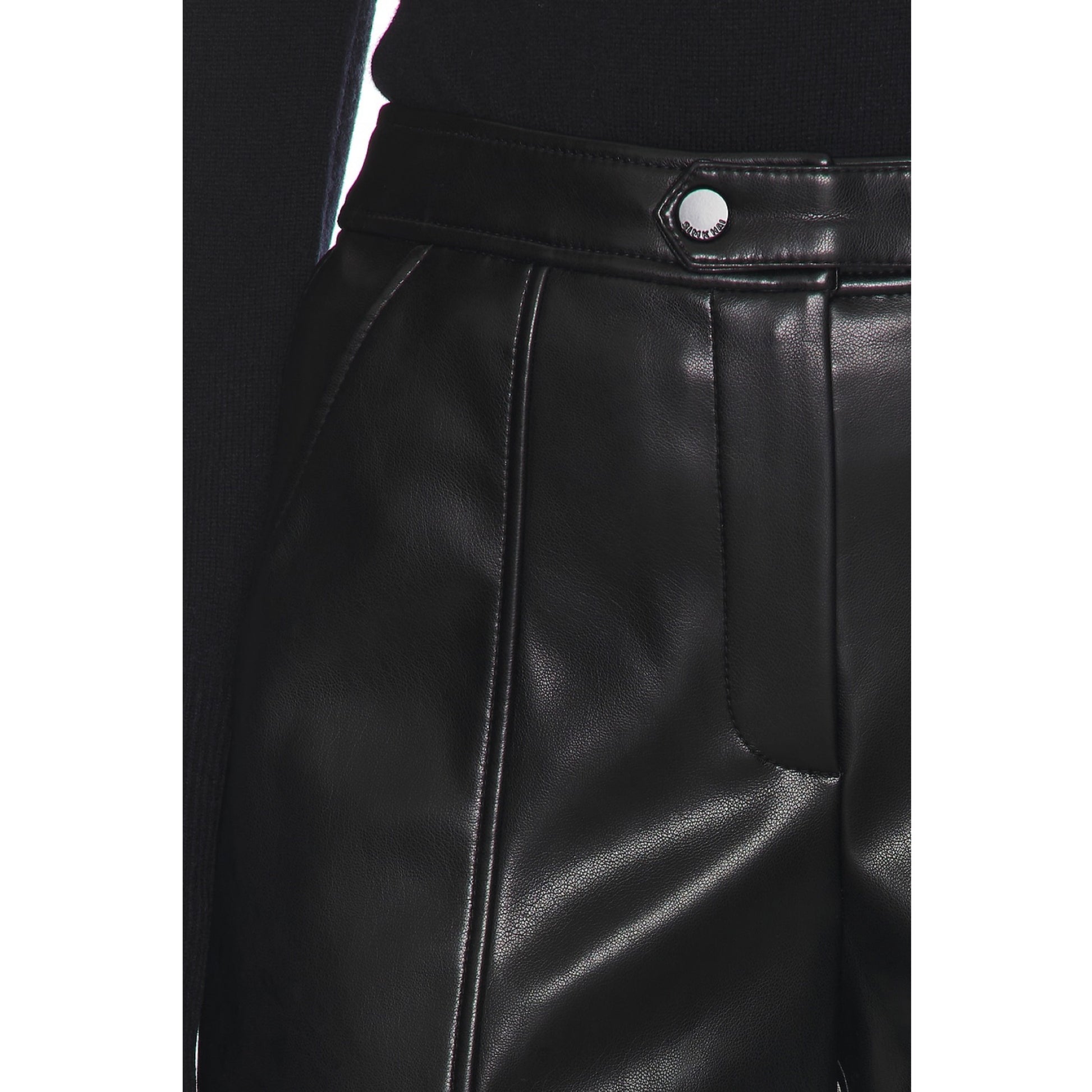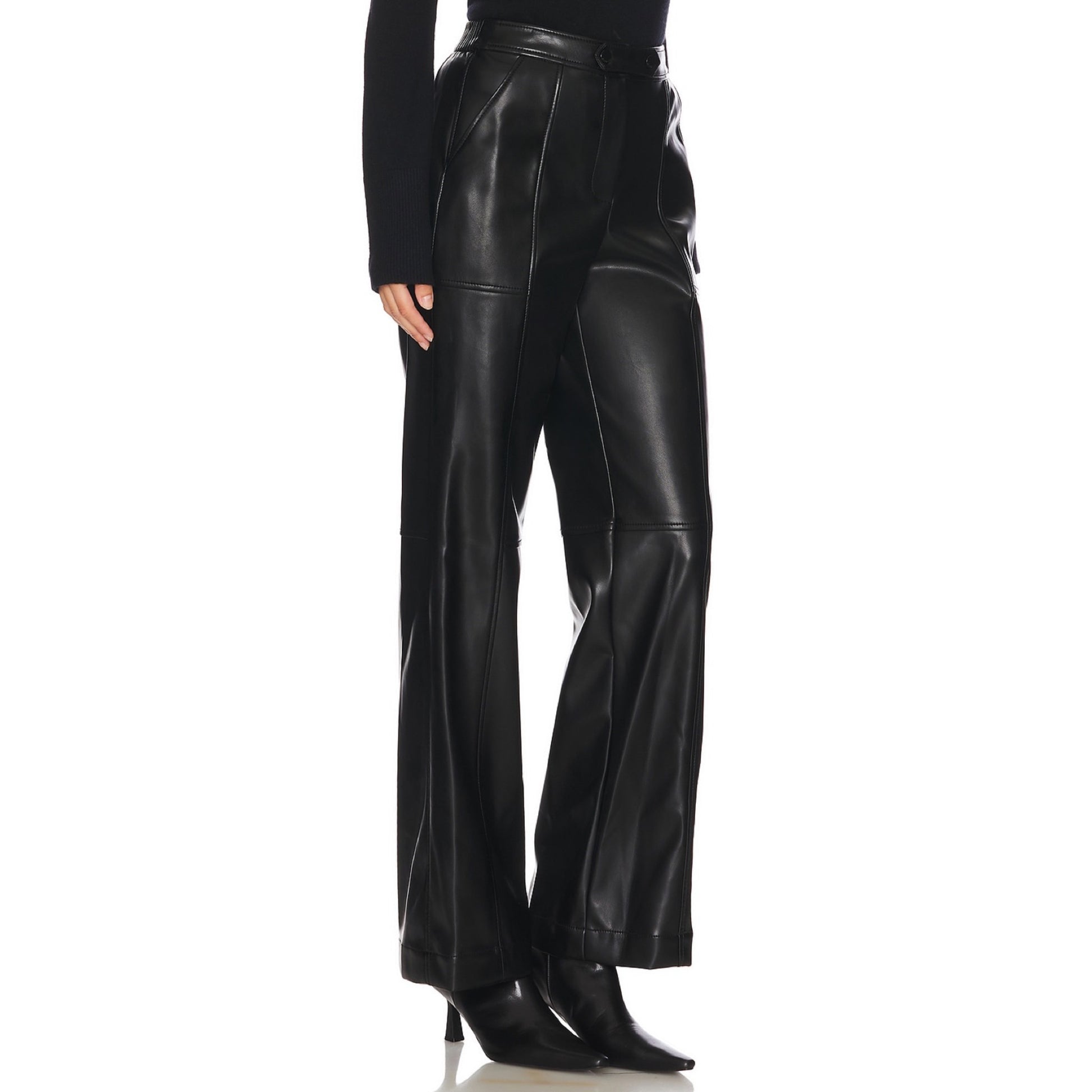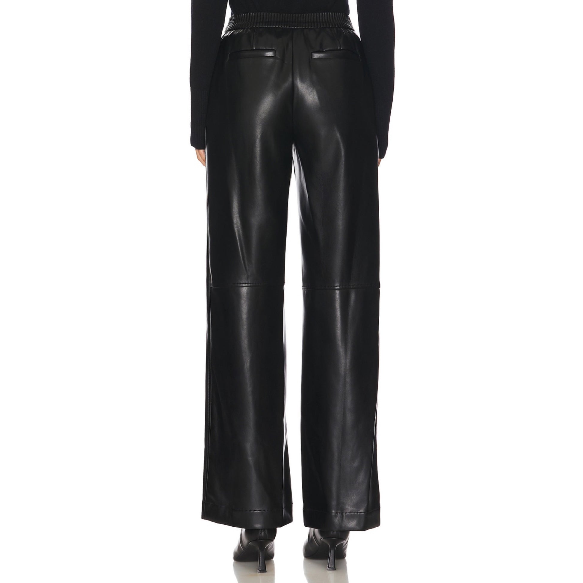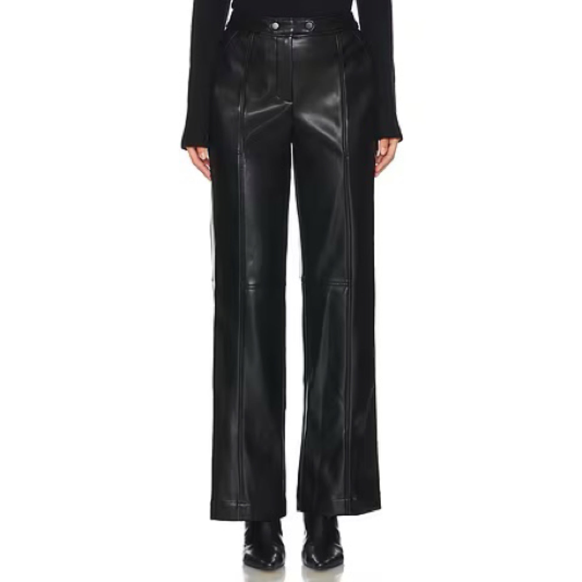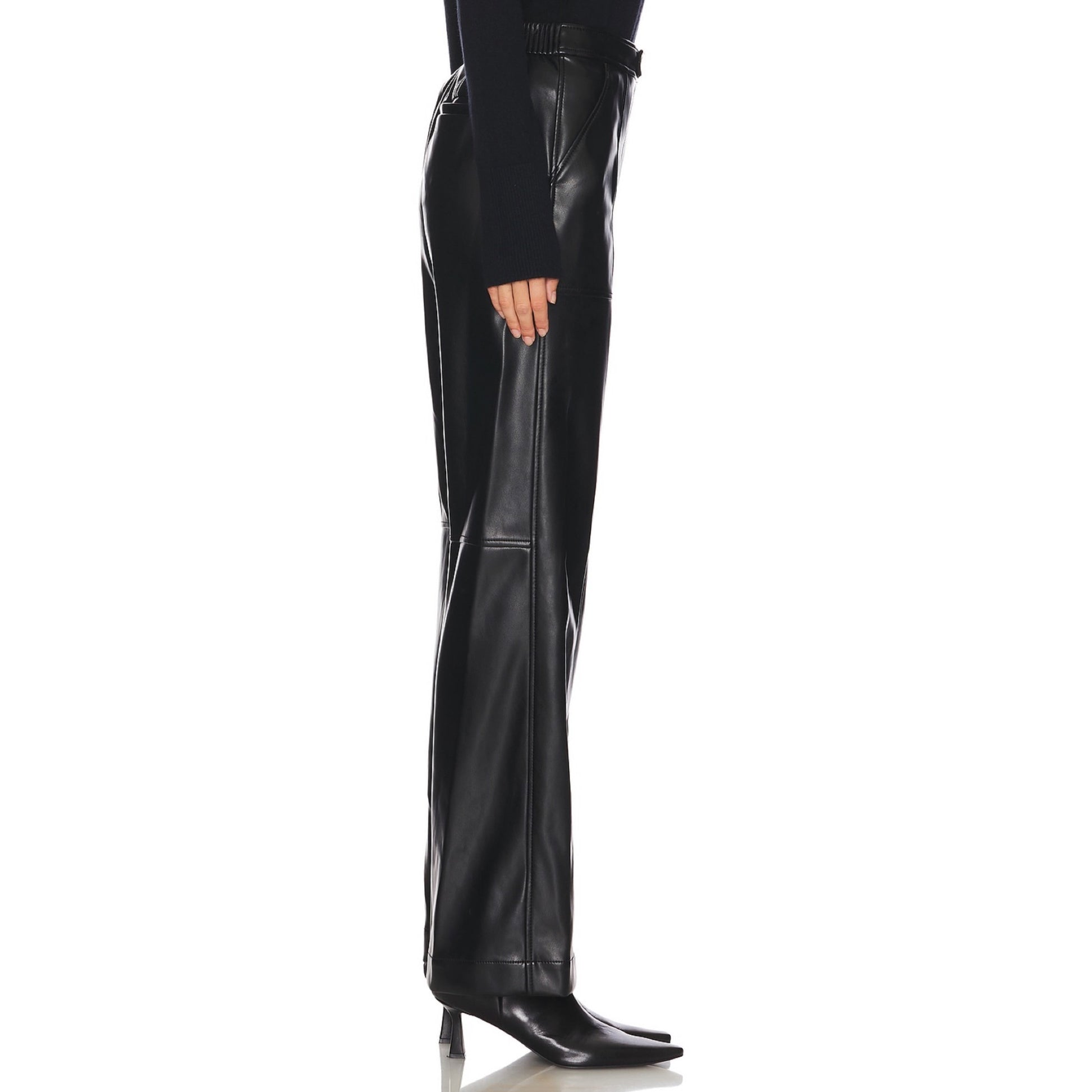 The Simkhai Mackenzie Straight Leg Pant blends contemporary edge with timeless design. Crafted from supple faux leather, these straight-leg pants offer a sleek silhouette that elongates the figure. Tailored details, including front patch pockets and a high waist with buttoned belt loops, enhance the structured appeal.