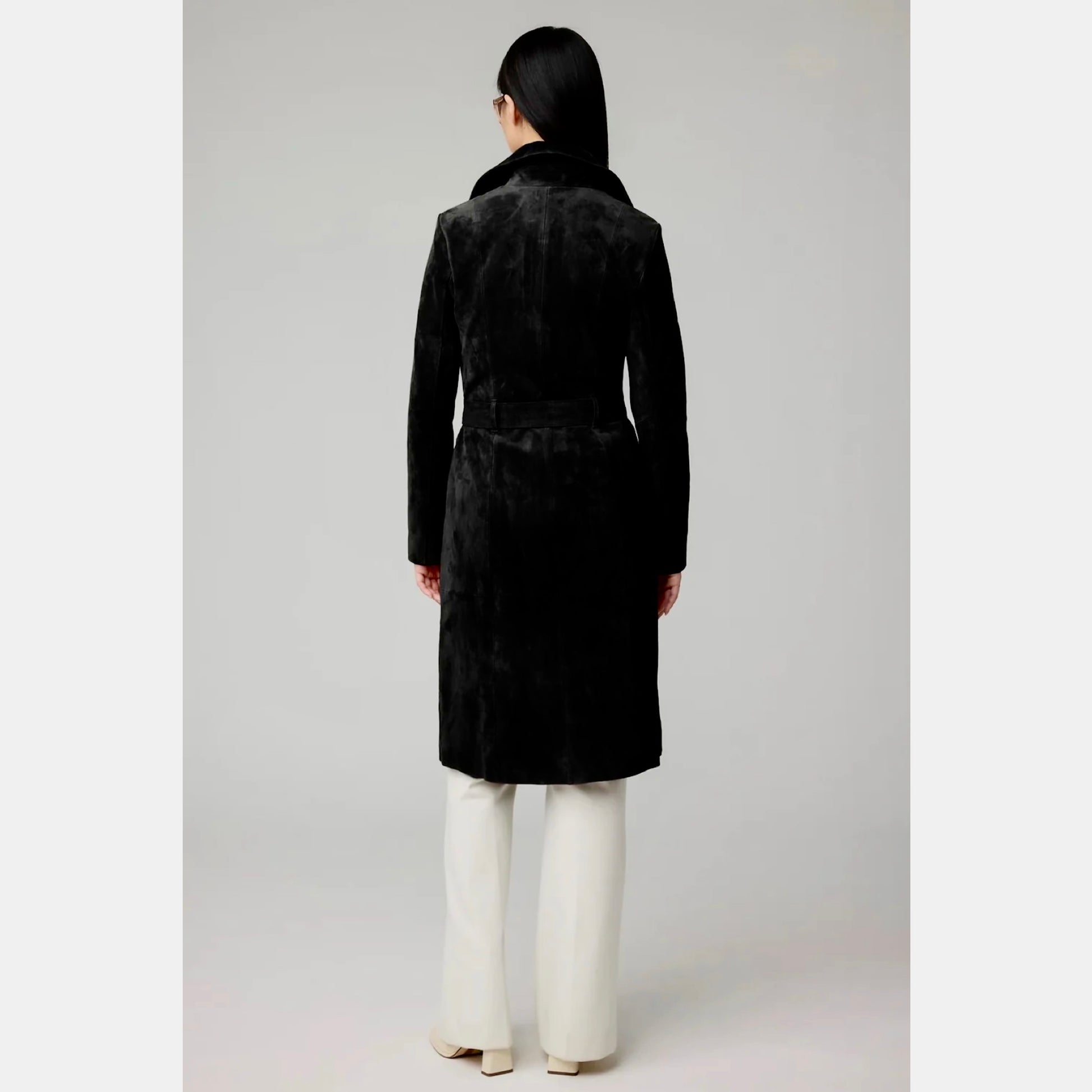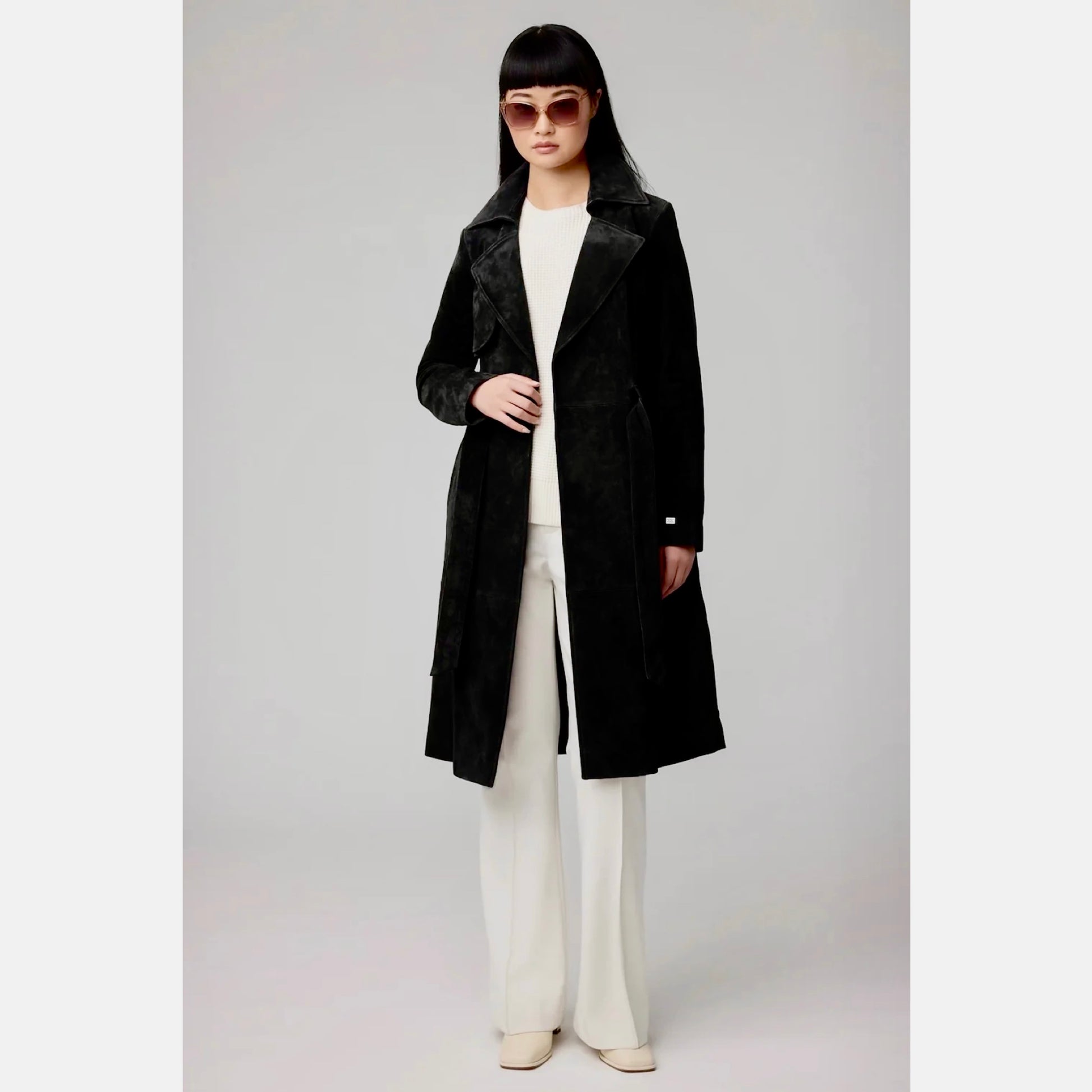 This gorgeous suede coat from Soia & Kyo is a long, lean trench style made from fabulously soft suede. The double-breasted design is fully lined, detailed with a Napolean collar and finished with a detachable tie belt, angled front welt pockets and a front storm flap.