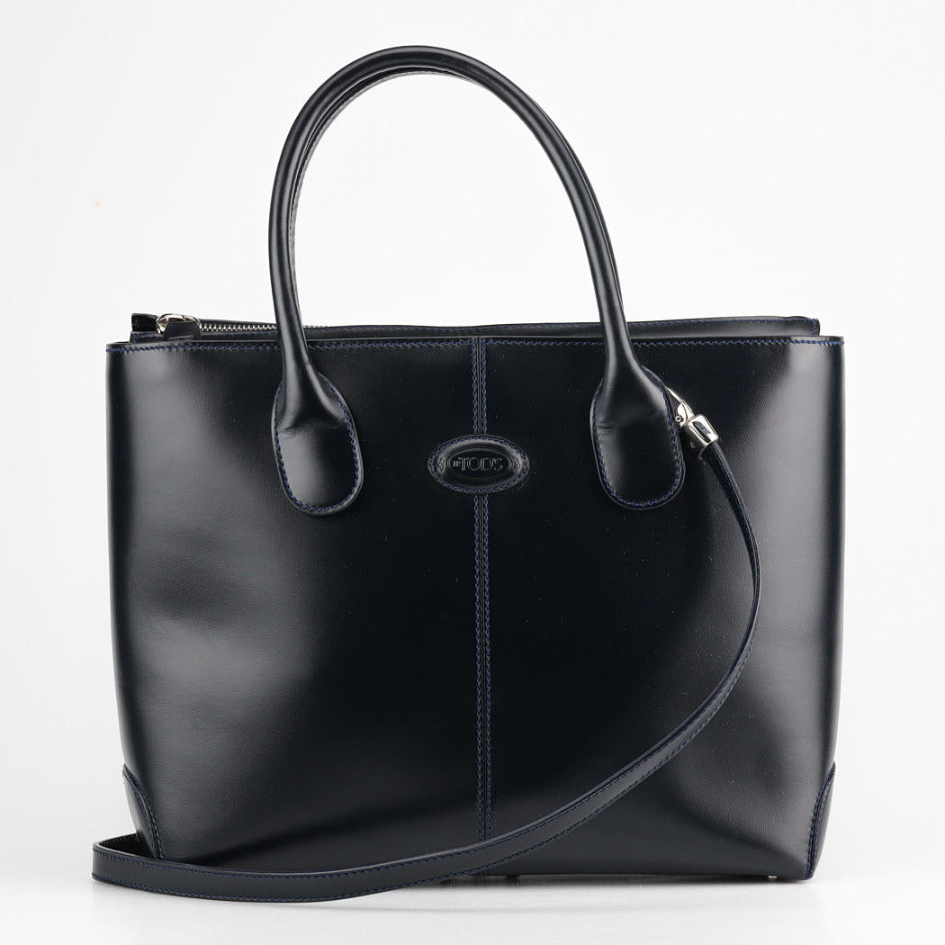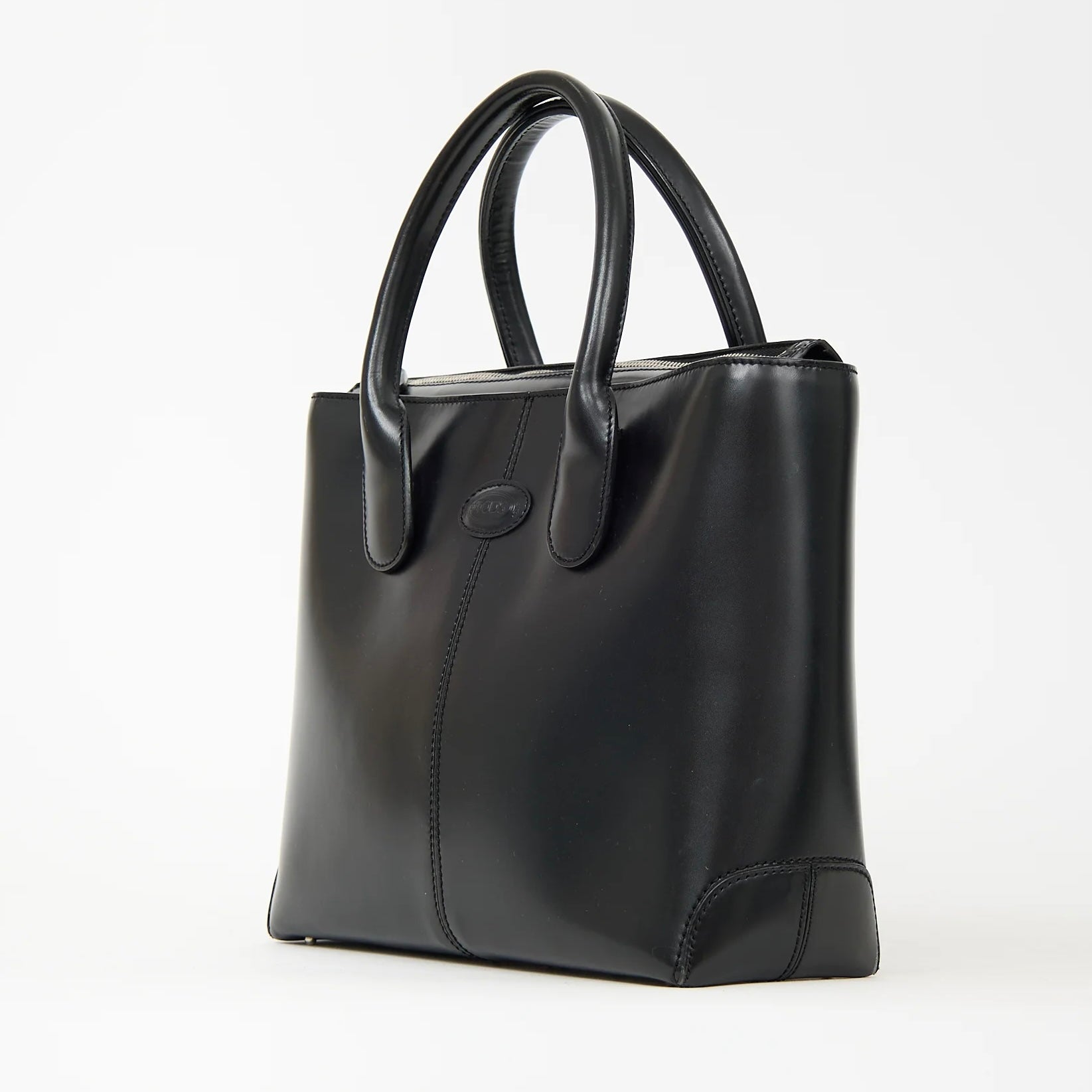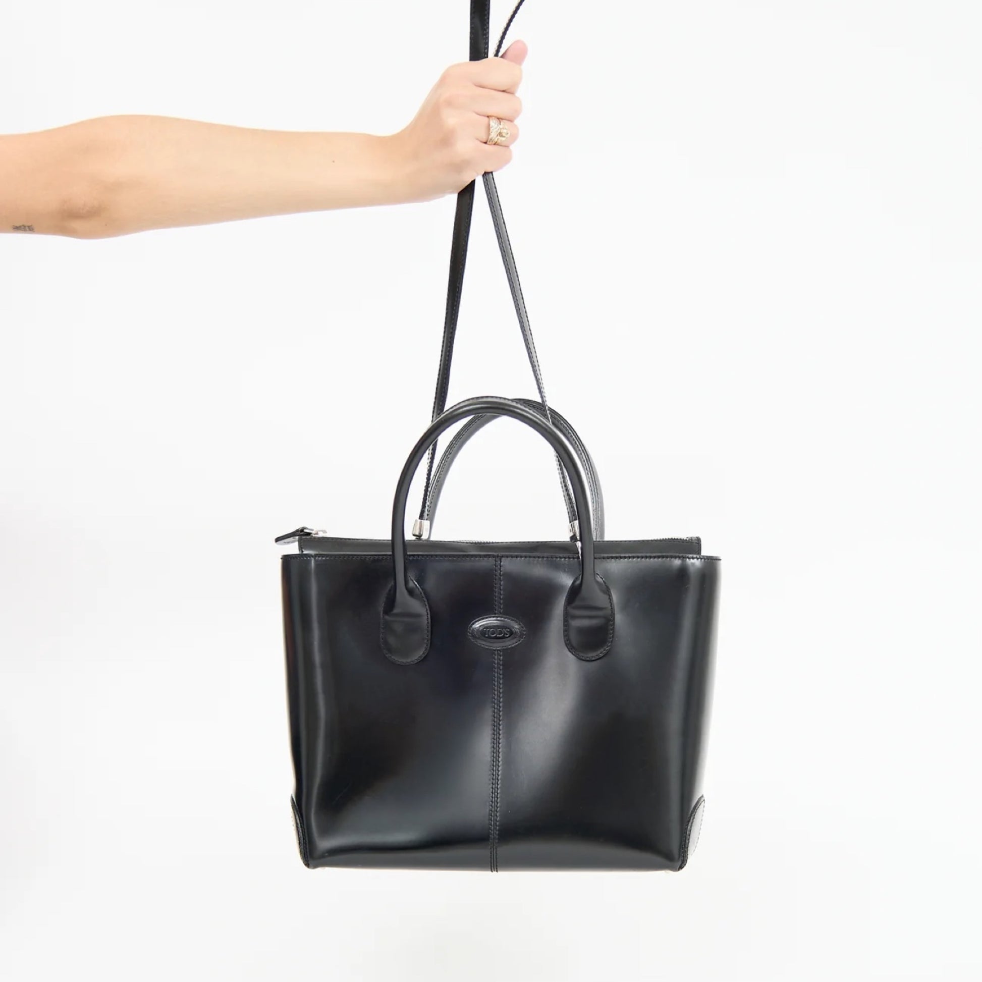 Tod’s Di Black Leather Gloss Top Handle Bag with Removable Crossbody Strap.