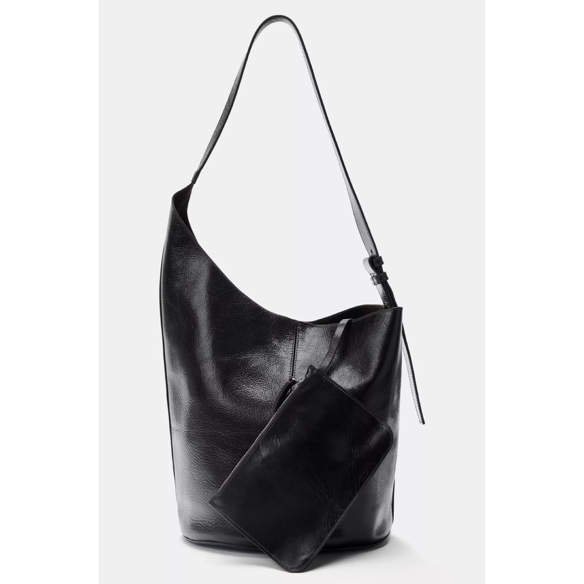 Asymmetric leather bucket bag. Adjustable shoulder strap. Magnetic closure. Wallet with removable pocket.